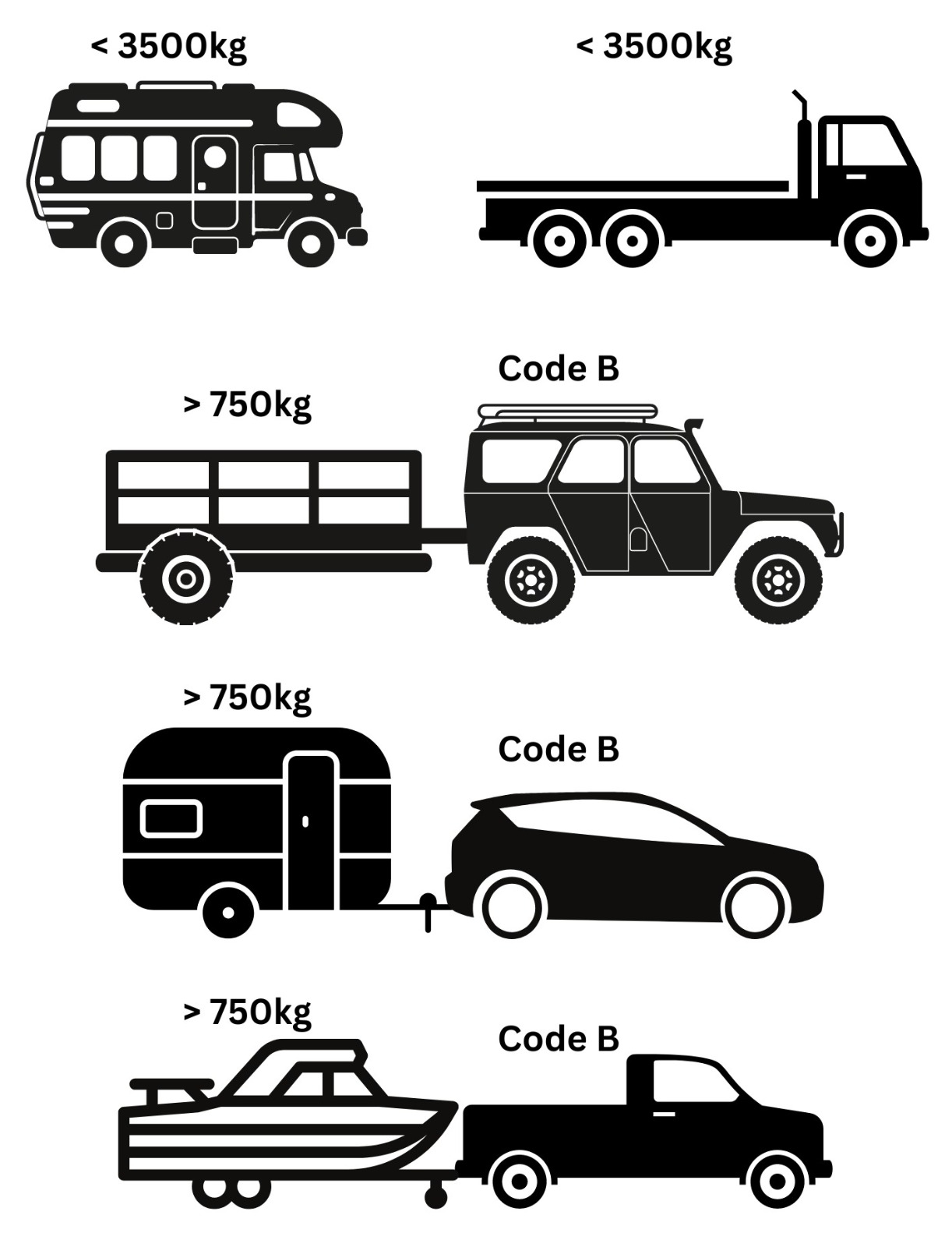 Articulated vehicles with a gross combination mass (GCM) of 3500kg or less; and vehicles allowed by Code B but with a trailer with GVM greater than 750kg.